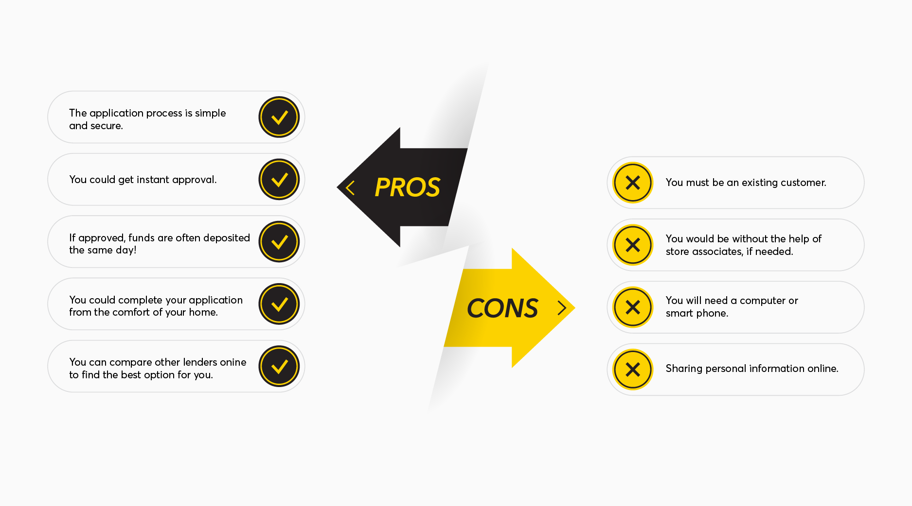 Most might say one of the biggest pros is convenience. You could be approved for a loan and funded without even leaving your house. If you live in a rural area, and the nearest store is far away, this may be a big timesaver for you.